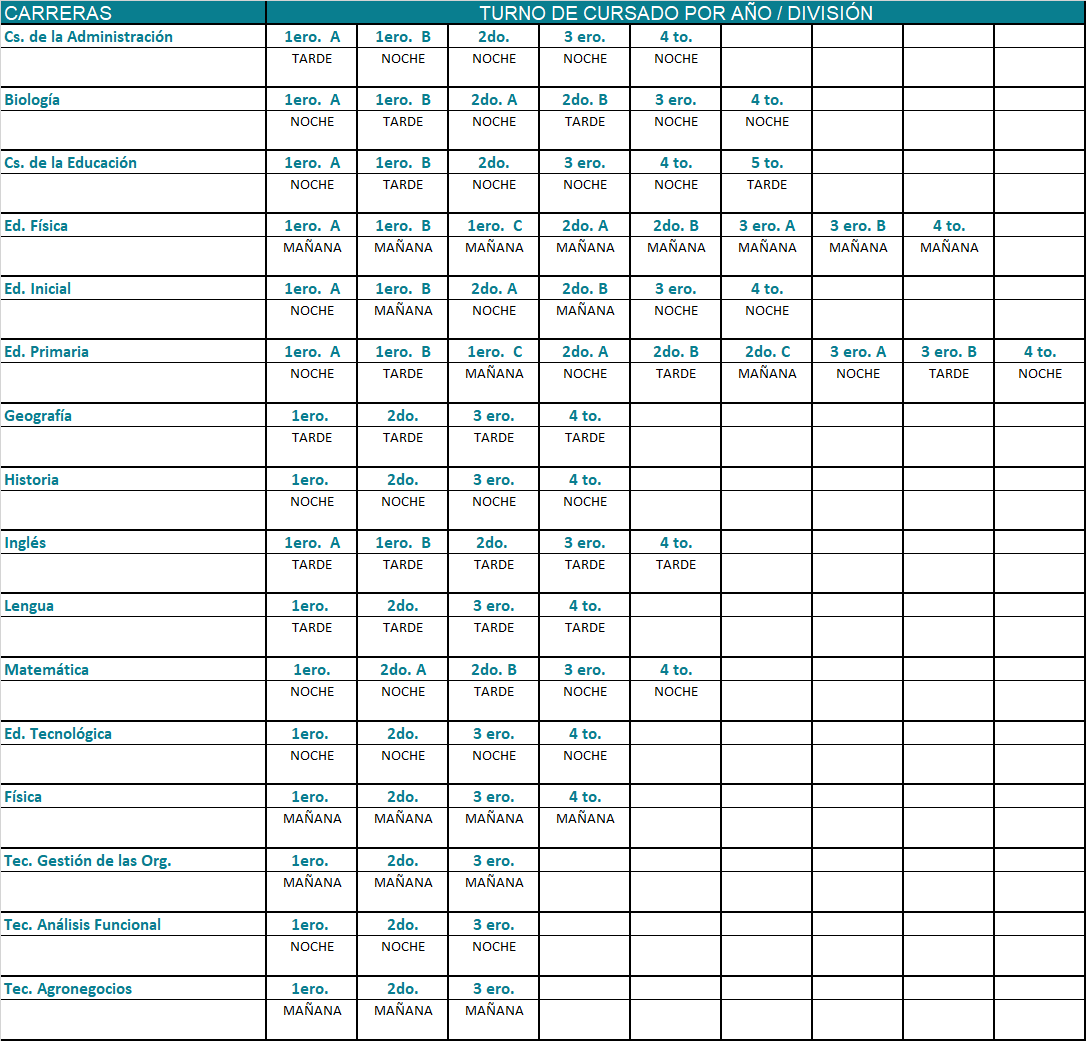 A continuación, se muestran los turnos por Carrera en los que se desarrollarán las clases: